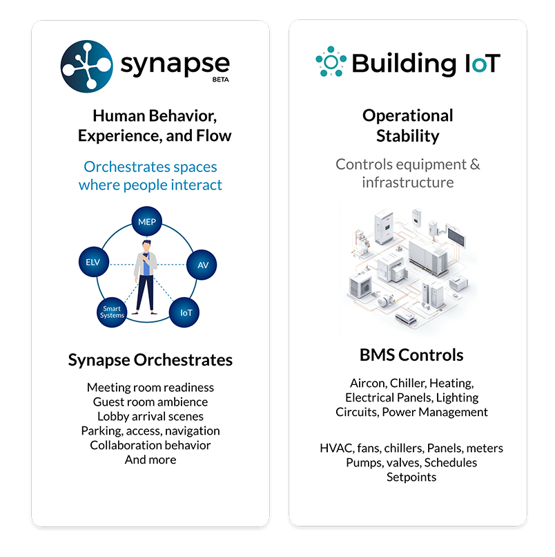 Where BMS controls the machines, Synapse controls the human experience — the places where people live, meet, collaborate, rest, and move.